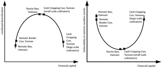 The four case study villages created an inverted U pattern with regards to livelihood diversification and financial capital and a U pattern when comparing vulnerability to extreme weather events and financial capital (axes show relative degrees of importance).