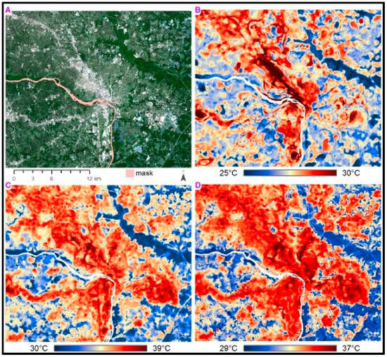 Richmond, VA (A) aerial imagery with major waterbodies masked; (B) morning urban heat island (UHI); (C) afternoon UHI; (D) evening UHI.