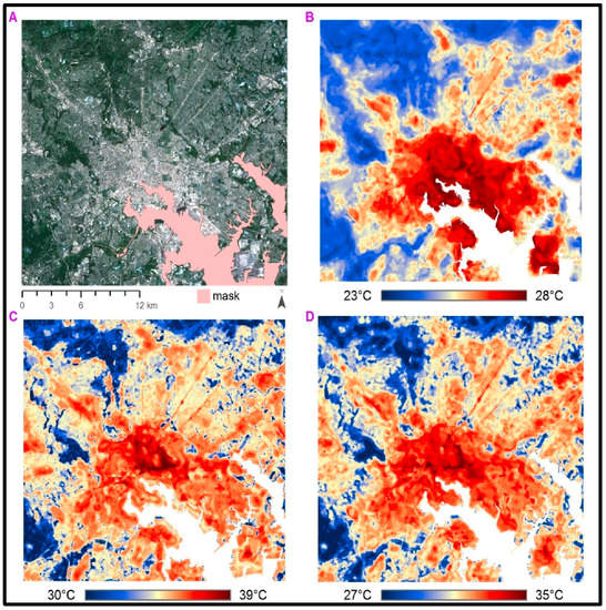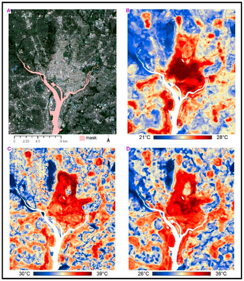 Washington, D.C. (A) aerial imagery with major waterbodies masked; (B) morning UHI; (C) afternoon UHI; (D) evening UHI.