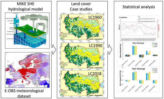 Given the uncertainty of future land cover changes due to socio-economic driving forces and local development policies applied, a scenario-based modeling framework can be beneficial in supporting the analysis of potential land cover changes, so as to mitigate potentially negative future impacts on a basin’s water resources. In order to investigate the effect of anthropogenic land cover changes to the hydrological cycle components and the main hydrometeorological factors of a regional agricultural watershed in Central Greece (Spercheios river basin) of great ecological value, three (3) land cover case studies were adopted, based on the land cover distribution documented in the following years: in 1960 (hereafter LC1960; baseline), in 1990 (hereafter LC1990; mid-period), and in 2018 (hereafter LC2018; current state). The modeling tool used was the physically-based hydrological model (MIKE SHE), while the high-resolution gridded observational daily meteorological dataset of Europe named E-OBS [27] from the EU-FP6 project UERRA [30] and the Copernicus Climate Change Service [31] was also employed to drive the model. Since the E-OBS gridded dataset had not been used before in similar studies in Greece, the statistical evaluation of its efficiency was considered to be obligatory before performing any further analysis. Finally, statistical tests and trend analysis were performed on the simulated time series of each land cover case study examined.