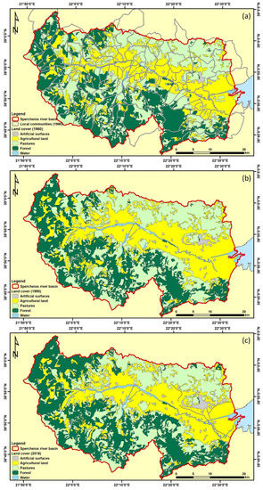 Land cover maps for the year: (a) 1960 produced for the present study, (b) 1990, and (c) 2018 from CORINE Land Cover (CLC).