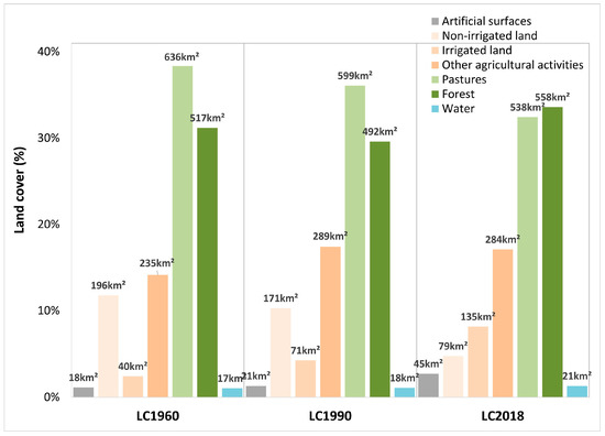 Agricultural land ranges from 28% (470 km2) in 1960, through 32% (531 km2) in 1990, to 30% (498 km2) in 2018. Permanently irrigated land has increased from 2% (40 km2) in 1960, through 4% (71 km2) in 1990, to 8% (135 km2) in 2018. On the contrary, non-irrigated land has decreased from 12% (196 km2) in 1960, through 10% (171 km2) in 1990, to 5% (79 km2) in 2018. Other agricultural activities, the majority of which were also irrigated, range from 14% (235 km2) in 1960, through 17% (289 km2) in 1990, to 17% (284 km2) in 2018. Pastures have decreased over the last decades (from 636 km2—38% in 1960, through 599 km2—36% in 1990, to 538 km2—32% in 2018). Finally, forested land change ranges from 31% (517 km2) in 1960, through 30% (492 km2) in 1990, to 34% (558 km2) in 2018 (Figure 3 and Figure 4).