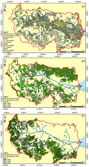 In order to investigate the impact of land cover change on the hydrological cycle components, the calibrated hydrological model of Spercheios river basin was integrated for 45 hydrological years (1960/61–2004/05) for three different land cover case studies. The specific period was characterized by a stable hydrographic network with minimum engineering interventions. Any hydraulic construction built after 2006 was omitted from simulation procedure, while all engineering interventions which took place before 1960 were included into the simulation, for the best representation of the actual state of the river network during the period 1960/61–2004/05. For the specific simulation period, the gridded time-series of the meteorological dataset used for the specific study area was complete and without gaps. Finally, the land cover case studies were selected according to the data availability and taking into consideration the overall anthropogenic interventions in the area, aiming at the better representation of each distinguished period. More specifically, until 1960, the major hydraulic interventions and the major agricultural reform of Greece had been completed, and ever since the area used for agricultural activities has been practically stable in the study area [41]. The first available documentation concerning the land cover distribution in Greece was from the year 1960 [42]. In 1990, the first pan-European land cover data collection was utilized based on satellite image processing (Coordination of Information on the Environment- CORINE Land Cover Programme [43]), and the most recent version is from the year 2018 [44]. Therefore, the following three land cover case studies in Spercheios river basin were implemented: (1) LC1960 based on the land cover of Spercheios river basin in 1960 (baseline), (2) LC1990 based on the land cover in 1990 (mid-period) and (3) LC2018 based on the land cover in 2018 (current state) (Figure 2).