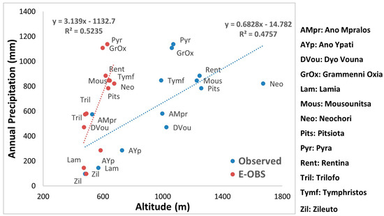 Based on the results of the comparison between in-situ observations from ground meteorological stations and the E-OBS dataset, there was sufficient agreement regarding precipitation (Table 5). The correlation coefficient R ranged between low (0.3) to very high positive (0.9; based on the criteria for correlation interpretation proposed by Hinkle et al. [39]); nevertheless, the p-value in all cases was statistically significant at the 0.05 level, except in the case of the meteorological station Ano Mpralos. Overall, the E-OBS dataset systematically underestimated annual precipitation for the entire period of evaluation, except in the case of Zilefto meteorological station for which the ME was calculated to be positive. E-OBS dataset was not able to sufficiently estimate the altitude effect on the precipitation rate, leading to a higher value of ME in meteorological stations of higher elevation (Table 5; Figure 6). This led to an average 37% underestimation of spatially-averaged annual precipitation of Spercheios river basin.