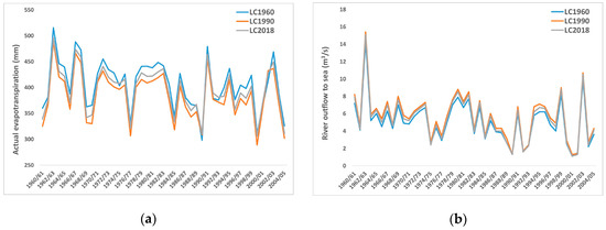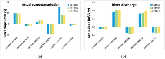 Sen’s slope for actual evapotranspiration (a) and river discharge (b) for LC1960, LC1990, and LC2018.