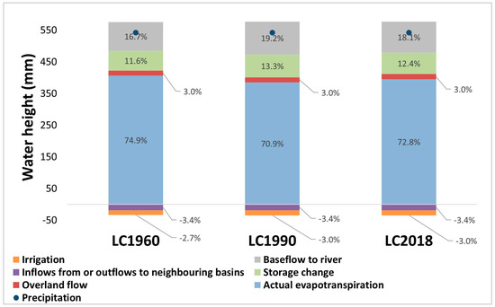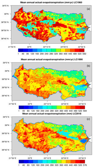 As far as mean annual actual evapotranspiration is concerned, the three land cover case studies present spatial differences. LC1960 is characterized by more inhomogeneous patterns than in LC1990 and LC2018 (Figure 8). It resulted in values exceeding 520 mm/yr and lower than 280 mm/yr at many areas. A possible explanation for this difference is the increased scattering of areas covered by forests, agricultural land and pastures in LC1960 which have effects of different magnitude on evaporation and transpiration (see Figure 2). Forests and agricultural land increased evapotranspiration in comparison with pastures and artificial surfaces [67]. In contrast to LC1960, LC1990 and LC2018 case studies are characterized by wider continuous areas covered by the same land cover. Hence, the pattern of mean annual actual evapotranspiration is smoother in LC1990 and LC2018 than in LC1960.