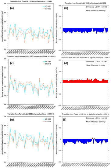 Timeseries, regarding areas characterized by transition from forest in 1960 to pastures in 1990, of (a) annual actual evapotranspiration (mm/yr) simulated by LC1990 (orange line) and LC1960 (blue line) as well as (b) their differences (red for positive and blue for negative). The same for (c,d) as well as (e,f) regarding transition from pastures in 1960 to agricultural land in 2018 and transition from forest in 1990 to agricultural land in 2018, respectively.