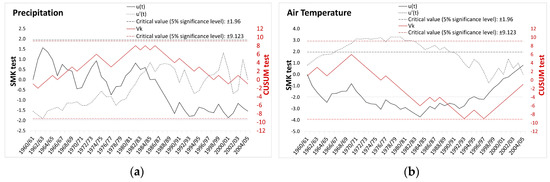 SMK and CUSUM tests for (a) precipitation and (b) air temperature.