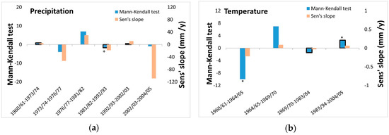 Finally, the trend magnitude for each trend period identified from the abovementioned statistical test was calculated based on Sen’s estimator of slope. This non-parametric statistic can be applied in cases of linear trend and determines the magnitude of change per unit time [65]. The Sen’s slope estimation test is defined for a season g as follows (Equation (10)):