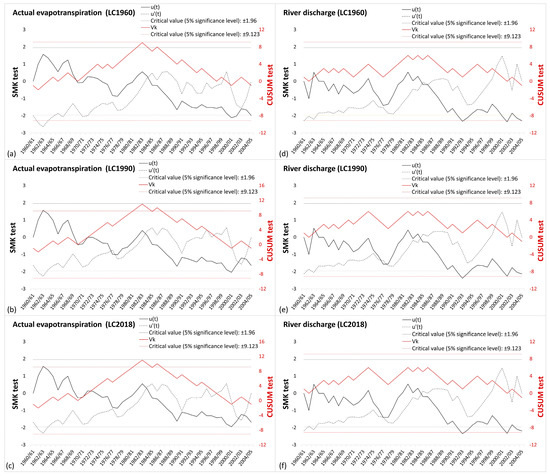 SMK and CUSUM tests for actual evapotranspiration for (a) LC1960, (b) LC1990, and (c) LC2018, and river outflow to Maliakos Gulf for (d) LC1960, (e) LC1990, and (f) LC2018.