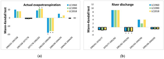 Results of Mann-Kendall test for actual evapotranspiration (a) and river discharge (b) for LC1960, LC1990, and LC2018. No border in columns indicates S test and black border Z test. (*) and (+) symbols indicate if the trend is significant at the α = 0.05 level and α = 0.1 level, respectively.