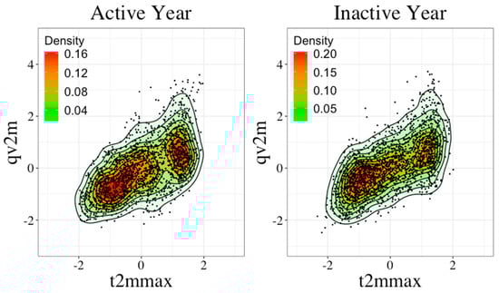 Scatter plots of daily maximum temperature (t2mmax) and specific humidity (qv2m) for the active and inactive years listed in Table 1. The differences between the active and inactive summer plots were measured by applying the Kolmogorov-Smirnov test to t2mmax and qv2m. The results of this test revealed that the distribution of qv2m for active and inactive years were significantly different (p-value = 0.005), while their distributions for t2mmax were less different (p-value = 0.02). Regardless of the magnitude of their differences, there are important differences between the climate variables of active and inactive years.
