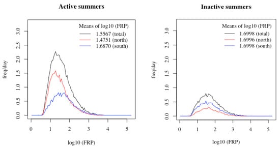 Number of Moderate Resolution Imaging Spectroradiometer (MODIS) fire pixels per day in the study domain as a function of the fire radiative power (FRP) for active and inactive summers. The red and blue lines indicate the number of fire pixels from the northern and southern domains, respectively, while the black lines represent all of California. The means for log10 (FRP) were calculated for each domain and are listed in the legend of both plots.