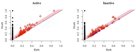 Persistence diagrams based on the daily maximum temperatures and specific humidity shown in Figure 1 for active and inactive summers. The black dots, red triangles, and blue squares indicate connected components, loops, and voids, respectively. The pink bands represent the confidence interval.