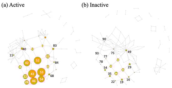 Mapper graphs for (a) active and (b) inactive summers. The sizes of circles at each node are proportional to the total number of MODIS fire pixels from the days included in each node. The numbers on each node are a sequence of numbers generated by mapper. The same numbers are depicted in the subsequent maps (Figure 5, Figure 6, Figures 8 and 9) as a reference.