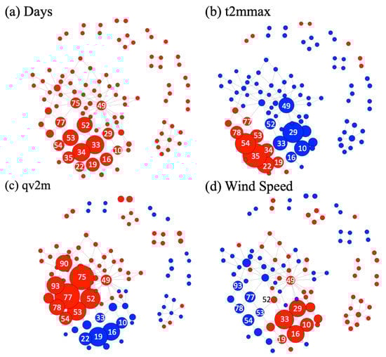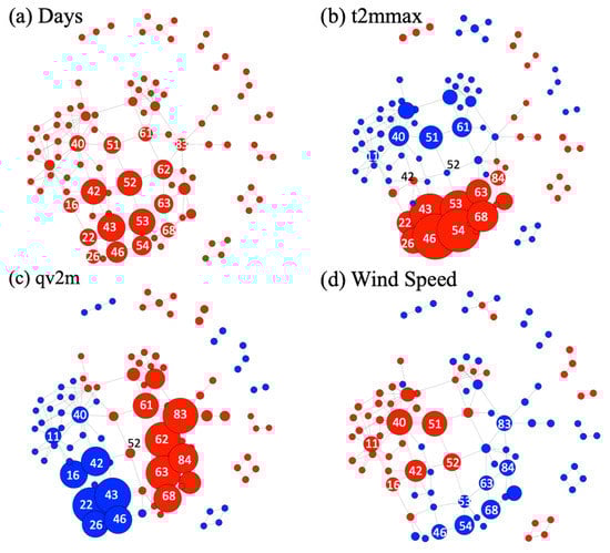 Mapper graphs for active summers. The sizes of the nodes are proportional to (a) the number of days at each node, the averages of (b) daily maximum temperature (tmax), (c) (2 meters) specific humidity (qv2m), and (d) surface wind speed. Red indicates that the averages are higher than the mean, while blue means that they are lower.