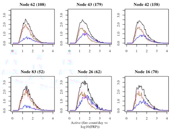A careful investigation of the nodes in Figure 5 revealed three types of patterns, as represented by the panels in Figure 7. Figure 7 shows the distribution of the MODIS fire pixel data as a function of FRP for selected active summer nodes. The black line plots the total fire pixel count by day from the study domain while the blue and red lines represent the fire distribution from the southern and northern domain, respectively. In all of the panels, northern California shows a higher frequency of weak fire pixels, though the relationship between north and south varies across the nodes. In node 62, for example, there were more fires in the north, while the numbers of fires were almost even between domains in node 43. Node 42 has a similar pixel distribution as node 43, but the intensity of fires in the north and south are more evenly matched.