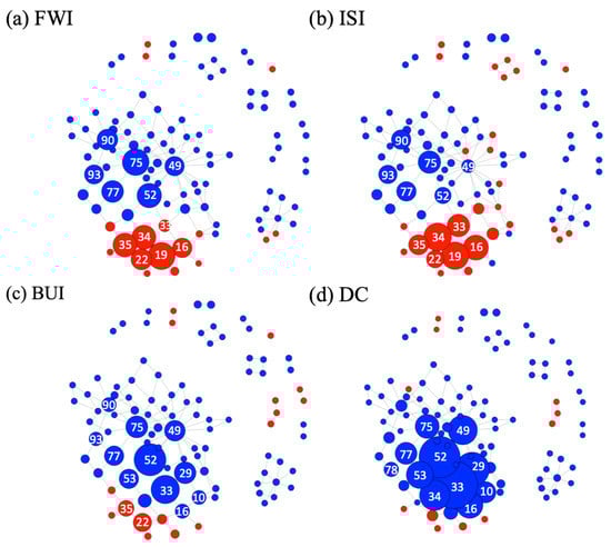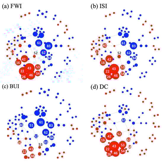 Mapper graphs for active summers. The size of nodes is proportional to (a) the Fire Weather Index (FWI), (b) the Initial Spread Index (ISI), (c) the Buildup Index (BUI), and (d) the Drought Code (DC). Red nodes indicate a positive average and blue nodes indicate a negative average.