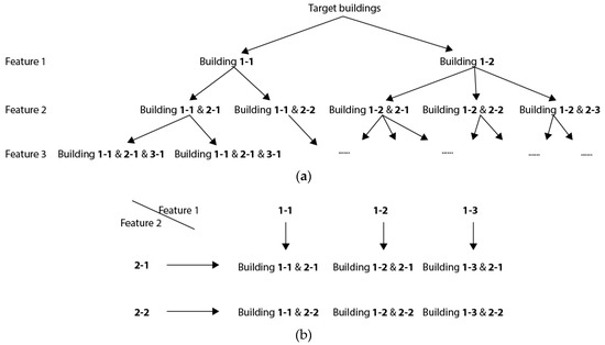 Once the key features are selected, the category structure could be defined. There are two main category structures: flow structure and matrix structure, as shown in Figure 1. The category process of a flow structure successively divides the whole building stock according to selected features. The matrix structure is formed with two main key features. For instance, in the TABULA (Typology Approach for Building Stock Energy Assessment) project [31], building types (single-family houses, terraced houses, and blocks) and construction periods were selected as the two main features. Both structures have strengths and weaknesses. For the flow structure, it could include enough key features to establish detailed building categories, but the key features and intervals should be carefully determined since too many categories could be generated and some categories may not be representative. For the matrix structure, only two key features are involved in categorization; therefore, other features should be carefully added into the description of archetypes, without influencing the category results.