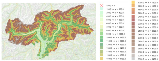 The whole region of South Tyrol covers 7400 km2 with altitudes ranging from 190 m to more than 3000 m (Figure 3). The surface area below 1000 m above sea level (a.s.l.) is 14.1% of the total area, while the surface area over 1500 m a.s.l. represents 64.4% of the total area [36]. Due to the mountainous topography, diverse climate conditions exist. To analyze and subdivide the climate, climate data of different locations in South Tyrol are required. In this paper, climate data used were from (1) Provincia Autonoma di Bolzano Alto Adige (including data of 30 representative weather stations), and (2) results of the 3PClim project [37].