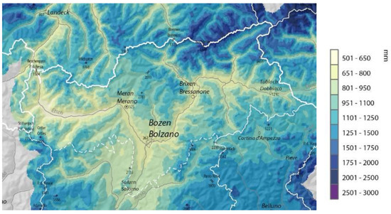 Mean annual total precipitation of South Tyrol (reference period: 1981–2010, http://www.3pclim.eu/).