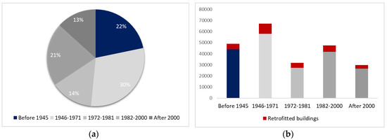 (a) Residential buildings by construction period; (b) residential buildings retrofitted during last 10 years by construction period [39].