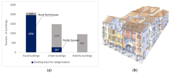 (a) Listed residential buildings in South Tyrol, and the building stock for categorization (data source: http://www.provinz.bz.it/kunst-kultur/denkmalpflege/monumentbrowser-suche.asp); (b) scheme of a Portici house (© Antonio Monteverdi, http://www.antoniomonteverdi.com/sito/?page_id=1228).
