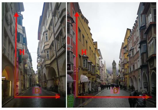According to the sample survey (Table 7), all the settlements of the Portici house are in compact form, and most of the buildings have two adjacent walls. When comparing the size of the settlements in climate Zones I and II, the dimension of settlements is generally larger in Zone I (notice the length of the Portici district in Table 7). Furthermore, although all settlements have a high density, there is a difference in the aspect ratio (distance to height ratio, D/H) of the main street in different climate zones (Figure 8).