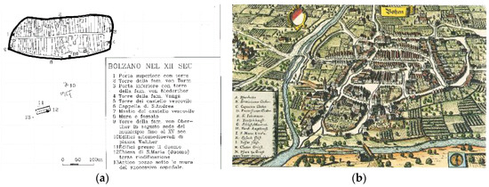 (a) Detailed plan of Bolzano at the end of the 12th century; (b) Bolzano in 1645, copper engraving by Matthaeus Merian [47].