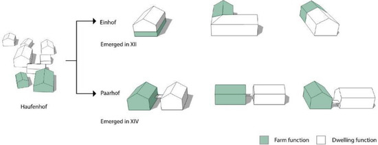 The oldest type of building layout is mentioned in “Lex baiuvariorum”, which is called Haufenhof with multiple buildings [52] (Figure 10). The buildings were limited by construction techniques; thus, most of them were small with one function: the dwelling, the barn, the stable, the granary, the bath, and the kitchen. With technical progress, larger buildings became possible. Paarhof and Einhof evolved from Haufenhof (Figure 11). Paarhof represents the most common type of farm in the Alpine region. In the survey of South Tyrol, about 65% of rural buildings can be described as Paarhöfe [53]. Paarhof can adapt well to every terrain, even to steep ground [54]. By the term of Paarhof, a farm layout is described where the dwelling building and the farm building stand independently. In most Paarhof, the farm buildings are constructed with wood, while the dwelling buildings are built with masonry. Einhof is a farm where dwelling function and farm function are located under one roof. It represents 15% of total rural residences in South Tyrol [53]. Like the Paarhof, the farm space is generally constructed with wood. Dwelling spaces, especially the kitchen and living room, are constructed with masonry to prevent fire accidents.