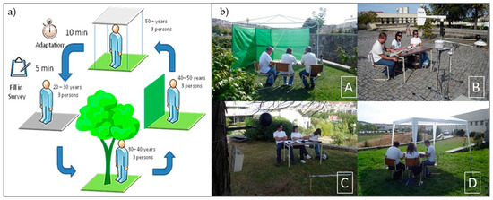 A total number of 12 persons (six men and six women), grouped into four age groups (20–30, 30–40, 40–50, and 50–60 years) participated in this study, wearing jeans and a white t-shirt (approximately 0.5 clo [66,67]). Each participant filed in a questionnaire assessing individual thermal perceptions. Each age group, with three participants, stayed seated, facing the sun and resting (metabolic rate of 55 to 70 W/m2 [67]) in each location for over 15 min (10 min adjusting to local conditions and five minutes filling in the questionnaire), moving to the next location in a rotation scheme (Figure 3a). After approximately 60 min, every group had gone through the four locations. This procedure took place in three periods during the day, starting in the morning at 09:00 h, again after lunch at 14:00 h, and in the mid-afternoon at 17:00 h. This experiment was repeated in three sunny days during the summer and early fall, in the months of June, July, and October, with 432 questionnaires, 36 for each of the surveyed individuals.