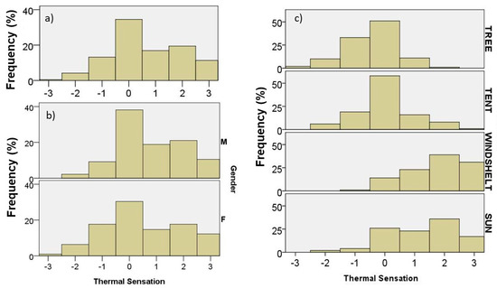 Thermal sensations frequency distribution: (a) in all locations; (b) by gender (M: male; F: female); (c) in structured experiment locations.