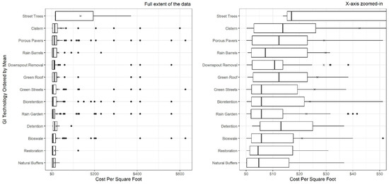 Cost per square foot for different GI technologies. Note: The figure on the left represents the full dataset, including all of the outliers, while the figure on the right limits the x-axis to show the majority of the cases. The boxes represent the interquartile range (IQR), the bars within the boxes represent the median, the points marked with an “×” represent the mean, and the dots are the outliers defined as 1.5 times the IQR in either direction.