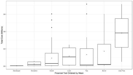 Total project cost by financial tool used to finance the project. Note: Only 102 cases (about 23%) provided information on the specific tools used. Projects often included more than one financial tool but did not specify the breakdown of how much funding came from each tool; this distribution represents the total cost of each project that used the given financial tool for at least a portion of the financing. The boxes represent the interquartile range (IQR), the bars within the boxes represent the median, the points marked with an “×” represent the mean, and the dots are the outliers defined as 1.5 times the IQR in either direction.