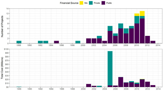 Age of project was defined as the year the project was completed according to the specification in the dataset. The completion year was only reported for 74 cases (about 17%); the other cases were either missing this variable or were not completed at the time of the survey. A sudden drop-off occurs around 2013 that is likely due to incomplete projects at the time of sampling and fewer samples being collected after the initial compilation. Given the limited data available, the number of projects and the costs seem to have increased dramatically in the later years, which is possibly explained by the increasing popularity of GI and greater widespread use in just this sample. Figure 4 illustrates this trend for both total cost and number of GI projects by year.