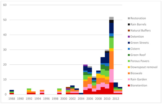 For the cases that reported year completed, it seems like the number of technologies used increased over time (at least for the technologies defined by the dataset). The most used technologies, bioswales, rain gardens, bioretention, and porous pavements, have been consistently used and popular over time. Perhaps as GI is more widely adopted, projects will continue to increase the number of techniques used as communities are more willing to experiment and the popularity of existing techniques will also expand as more technologies demonstrate their effectiveness, which in turn is likely to draw more funding and at least the need for funding. Figure 5 exemplifies the use of different GI techniques over time in just the convenience dataset. Other studies have identified this trend as well, for example, in a three-city comparison involving Portland, Baltimore, and Phoenix [9].