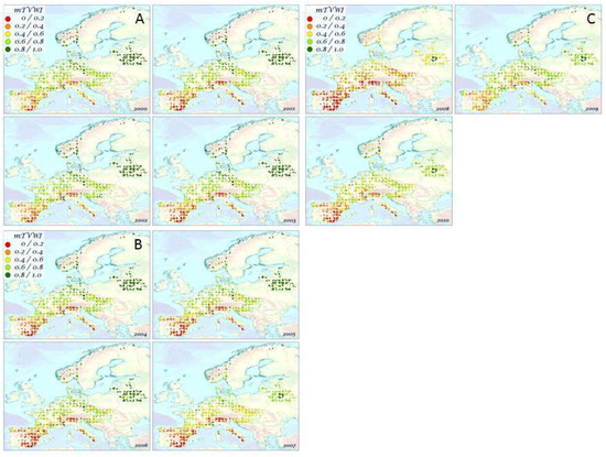 The spatial distribution of the mTVWI values for the 19 plant species over the time period 2000–2010, is shown in Figure 2A–C. A north–south gradient in Europe is highlighted. Minimum mTVWI values (0–0.20) were mainly found in Southern Europe (Italy and Spain) while the maximum (0.80–1) were observed in Northeastern Europe (Belarus and Norway). In Central Europe, we found mTVWI values ranging from 0.40 to 0.80. Mediterranean evergreen oak (Q. ilex L.) showed a low mTVWI value (0.17) whilst B. pubescens, a typical Northern European species growing in wet conditions, showed a higher mTVWI value (0.87). In general, we found that broad-leaf deciduous species showed higher mTVWI values than conifers and the broad-leaf evergreen (Table S1). The analysis of variance (ANOVA) corroborated this evidence. In fact, the ANOVA and Tukey post hoc test indicated significant differences (p < 0.05) among mean mTVWI values referring to conifers, broad-leaf deciduous, and evergreen species for all years (Figure S3, Table S2). Taking into account temporal variations, Figure 3 shows the mean annual mTVWI values (±standard error, SE) over the time period 2000–2010 when considering all tree species together. We found the lowest mTVWI values in 2007 and 2008 (0.49 ± 0.01 and 0.33 ± 0.01, respectively) whilst in 2000, 2002, and 2009 we found mTVWI values ranging from 0.60 to 0.63.