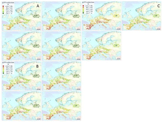 The percentage change of GPP due to mTVWI is shown in Figure 4A–C. The largest decrease occurred in Mediterranean countries, whereas the smallest decrease occurred in Belarus and Norway for all considered years. Italy and Spain showed a GPP reduction ranging from 40 to 100%. Central Europe presented a GPP reduction ranging from 20 to 40% for all years except for 2007 and 2008, where the GPP reduction reached 80%. Northern and Northeastern Europe were characterized by a small GPP reduction (0–40%). Table 3 shows a plant species-based GPP reduction (%) for all years. Conifers showed a mean GPP reduction of nearly 50% ranging from 40% in P. sylvestris to 80% in P. halepensis, P. nigra, and P. pinaster. The broad-leaf deciduous species showed an average GPP reduction close to 40%, with some species showing higher reductions (54%, F. sylvatica and Q. pubescens) and other species with limited GPP reduction (20% B. pubescens, B. pendula, P. tremula). By contrast, Q. ilex presented values of GPP reduction close to 70% for all considered years. Figure 5, Figure 6, Figure 7, Figure 8 and Figure 9 show the average GPP reduction values over the time period 2000–2010 (standard deviations are shown in Figure S4). The largest decrease occurred in F. sylvatica, P. halepensis, P. nigra, P. pinaster, and Q. ilex, whereas the smallest decrease occurred in B. pendula and B. pubescens.