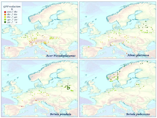 The mean species–specific GPP reduction (%) for A. pseudoplatanus, A. glutinosa, B. pendula, B. pubescens over the time period 2000–2010.