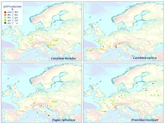 The mean species–specific GPP reduction (%) for C. betulus, C. sativa, F. sylvatica, F. excelsior over the time period 2000–2010.