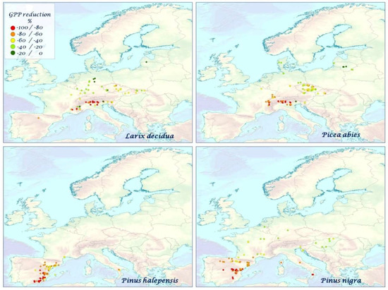 The mean species–specific GPP reduction (%) for L. decidua, P. abies, P. halepensis, P. nigra over the time period 2000–2010.