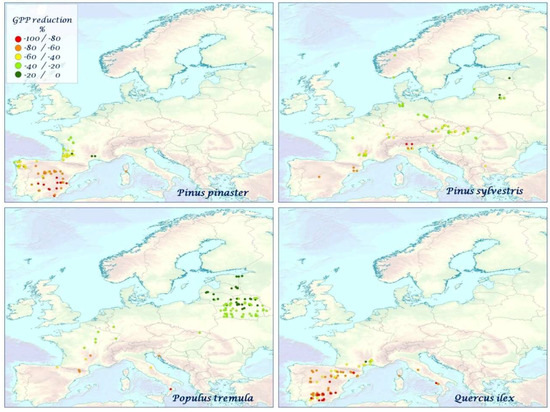The mean species–specific GPP reduction (%) for P. pinaster, P. sylvestris, P. tremula, Q. ilex over the time period 2000–2010.