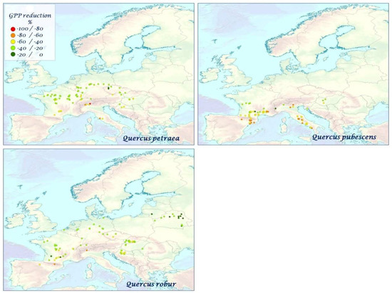 The mean species–specific GPP reduction (%) for Q. petraea, Q. pubescens, Q. robur over the time period 2000–2010.