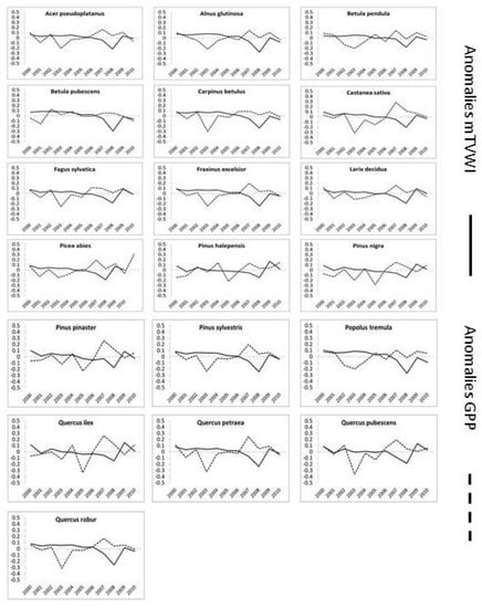 The term anomaly is defined here as the difference between the value of a variable (e.g., GPP and mTVWI) for a single temporal period (year) and the grand mean of the same variable over a given time period (2000−2010). The analysis of anomalies was performed for each analyzed tree species, displaying GPP and mTVWI anomalies together in order to evaluate a recurrent pattern and to identify all deviations from the grand mean.