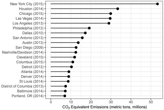 Top 20 U.S. city emitters of carbon dioxide equivalent. This figure displays the carbon dioxide equivalent emissions (millions of metric tons) for the top 20 emitters amongst U.S. cities. Estimates are retrieved from Nangini et al. [15].