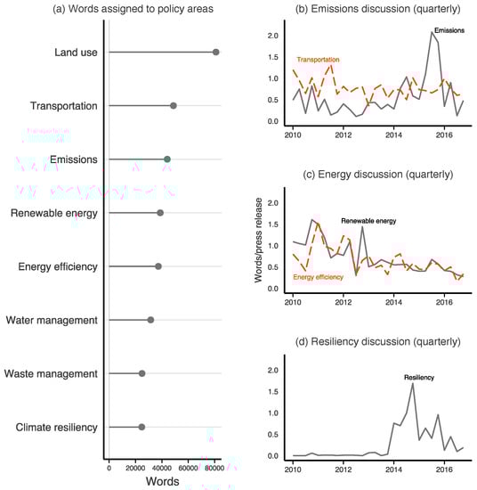Discussion of key policy areas. (a) Provides the total number of words assigned to each of the main “seeded” topics using the model described in Section 2.2. (b–d) Quarterly discussion of Emissions and Transportation, Energy efficiency and Renewable energy, and Climate resiliency, respectively. Word totals are normalized by the number of press releases in each quarter.