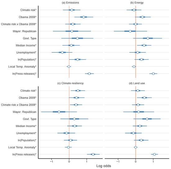 Explaining variation of climate-related themes in city press releases. This plot illustrates the results of a set of Bayesian multi-level logistic regression models, which estimate the effect of climate risk, political partisanship, and other covariates on whether a city discusses the following climate-related themes in a given month: (a) Emissions, (b) Energy (Energy efficiency & Renewable energy), (c) Climate resiliency, and (d) Land use. Circles represent posterior means, thick whiskers represent 50% credible intervals, and thin whiskers represent 95% credible intervals. Standardized variables are denoted with an asterisk (*).