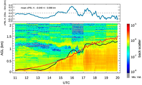 Backscatter observed by collocated CWAL in the bottom panel with the observed and simulated convective boundary layer (CBL) height differences in the top panel. In the bottom panel, the solid black and red lines represent the CBL heights obtained based on the CWAL backscatter profiles and PBL heights based on the simulation of DALES, respectively. The blue solid line in the top panel indicates the differences between observed and simulated PBL heights (ΔPBL heights = observed—simulated) in the top panel. The mean ΔPBL height was −0.05 km with a standard deviation of 0.1 km.