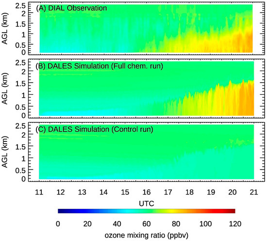 (A) Ozone profiles observed by ozone DIAL, (B) simulated of DALES with full chemistry run, and (C) simulated by DALES in the control run without chemistry or dry deposition.