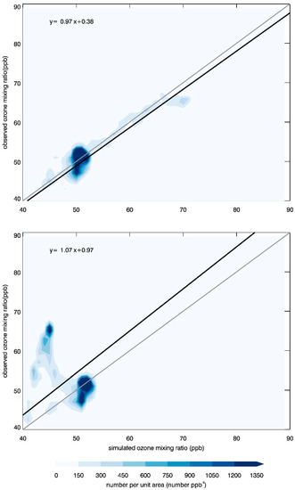 The scatter plot of observed and simulated ozone. The top and bottom panels represent the standard run vs. the observations and the control run vs. the observations, respectively. The black lines are the linear regression fitting function, and the gray lines are linear regression functions.